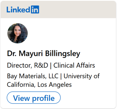 If you came here looking for Dr. Mayuri Billingsley's professional work in the medical device industry, please click on the badge to go to her LinkedIn profile